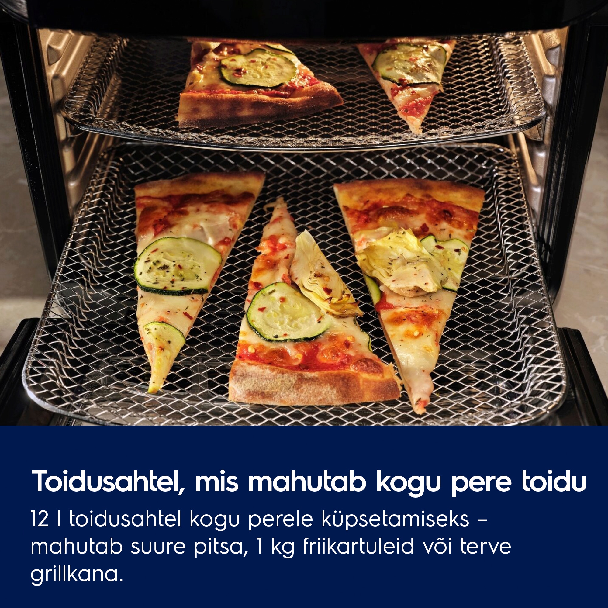 Saavutage maksimaalne universaalsus 5 küpsetusrežiimiga ahjus: kuumaõhufritüürimine, küpsetamine, soojendamine, kuivatamine ja vardas praadimine. Suur, 12 l mahutavus on ideaalne toidu valmistamiseks kogu perele. Klaasukse abil saate toidu valmimist jälgida ilma ust avamata.