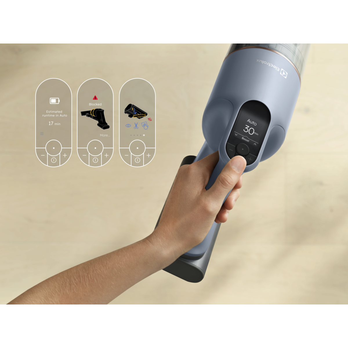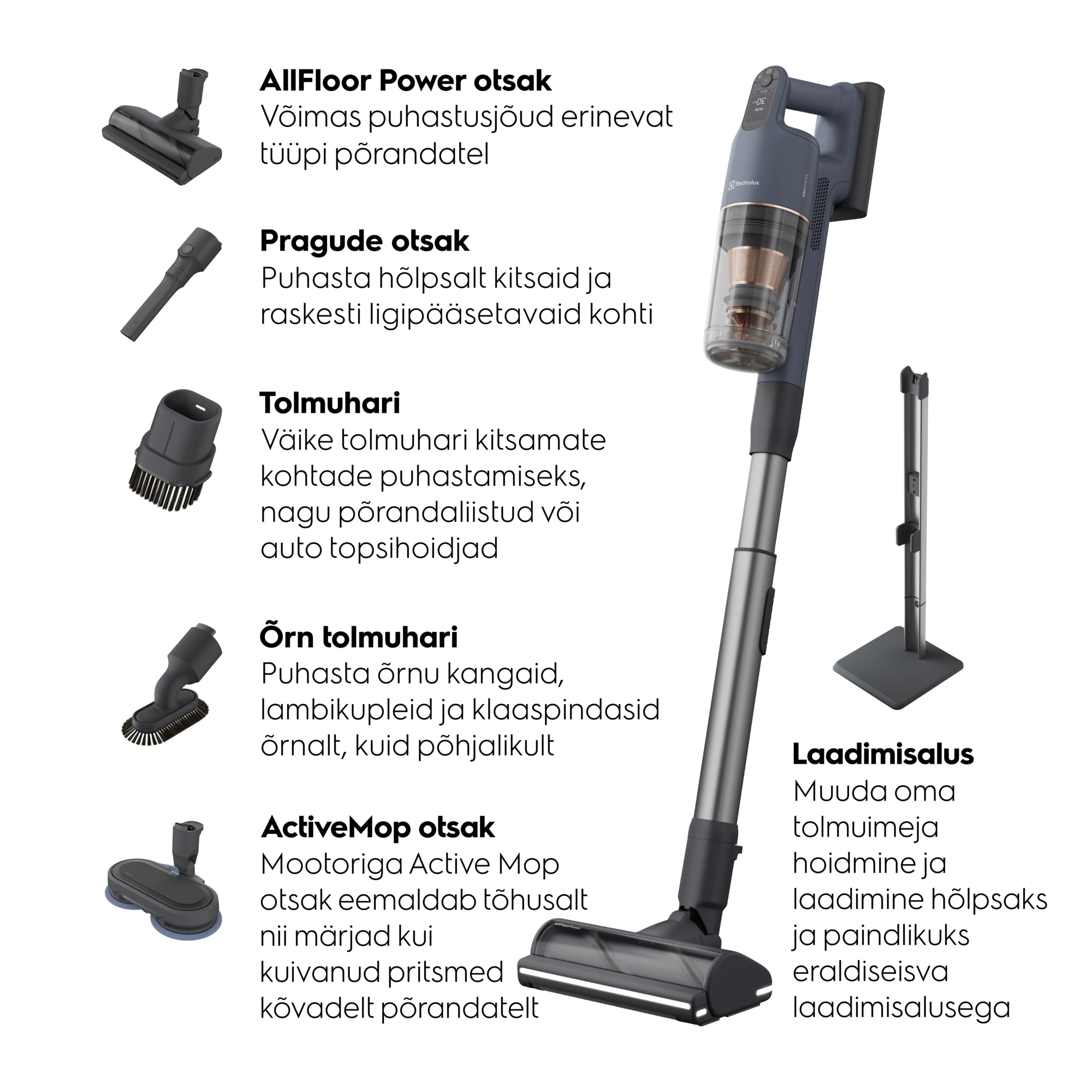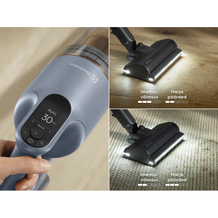 Püsiv tõhusus. Otsakuga AllFloor Power 900 seeria juhtmeta tolmuimeja on ainus juhtmeta tolmuimeja, mis ühendab oma klassi pikima tööaja kuni 100% tõhusa tolmuimemisega.*
