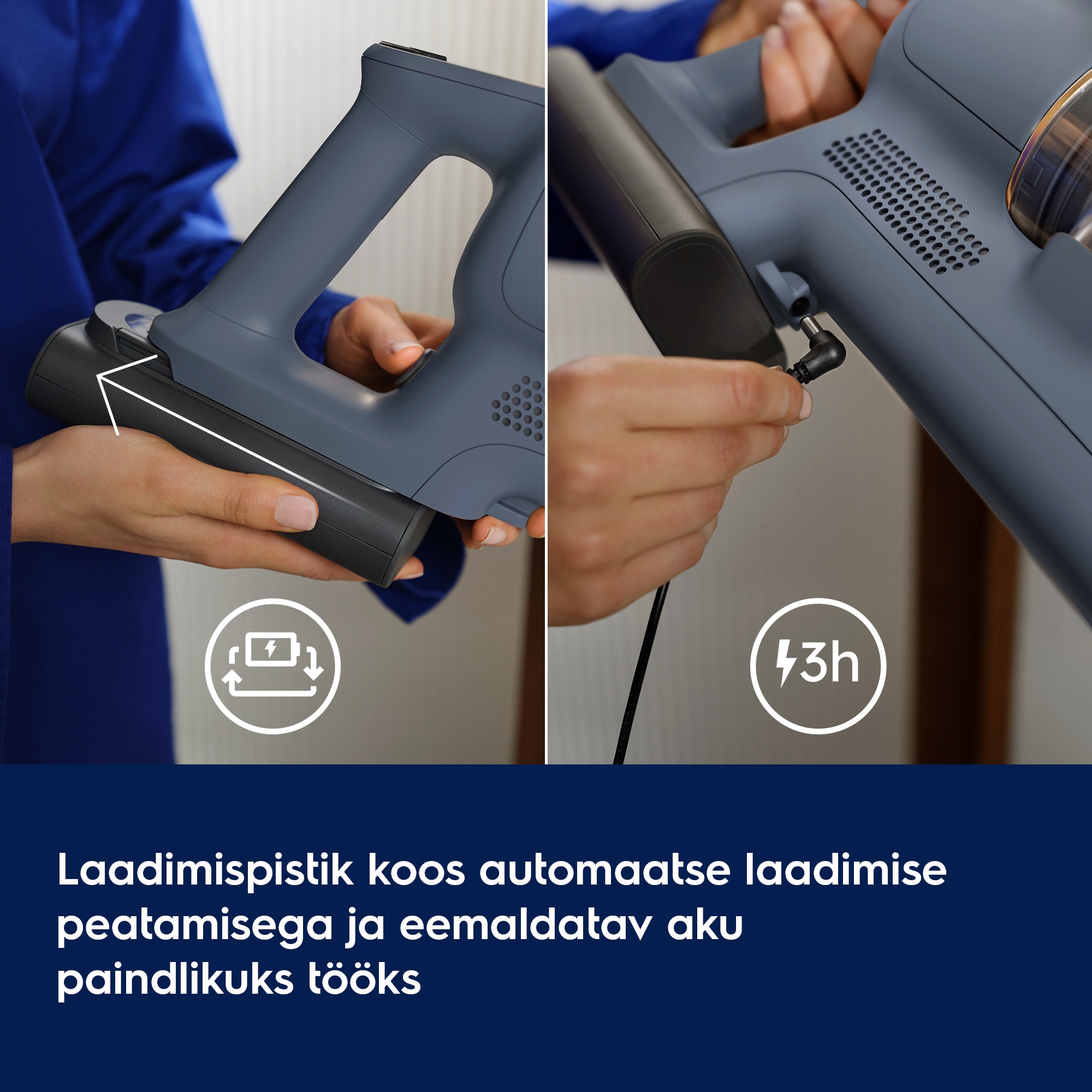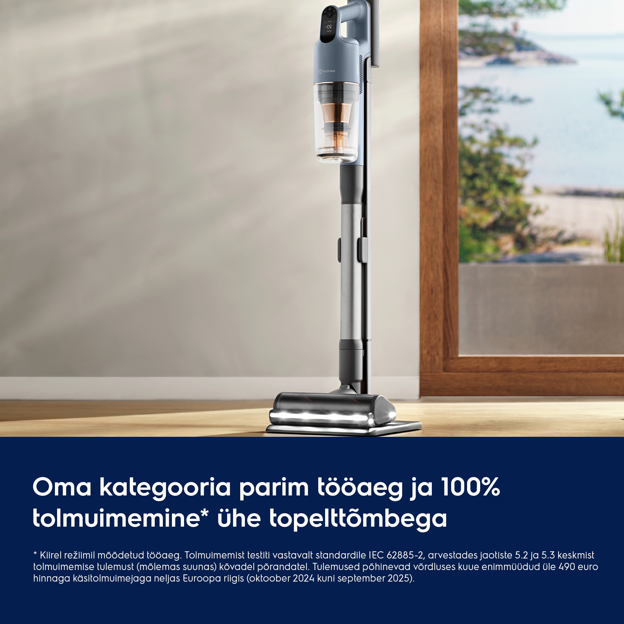 * Tööaega on mõõdetud kiirrežiimil. Tolmuimemise tõhusust on testitud standardi IEC 62885-2 järgi, arvestades keskmist tolmuimemise tulemust 5,2, 5,3 (mõlemas suunas) kõvadel põrandatel. Tulemused põhinevad võrdlusel kuue enimmüüdud käsitolmuimejaga, mille hind on neljas Euroopa riigis üle 490 euro (okt 2024 kuni sept 2025).