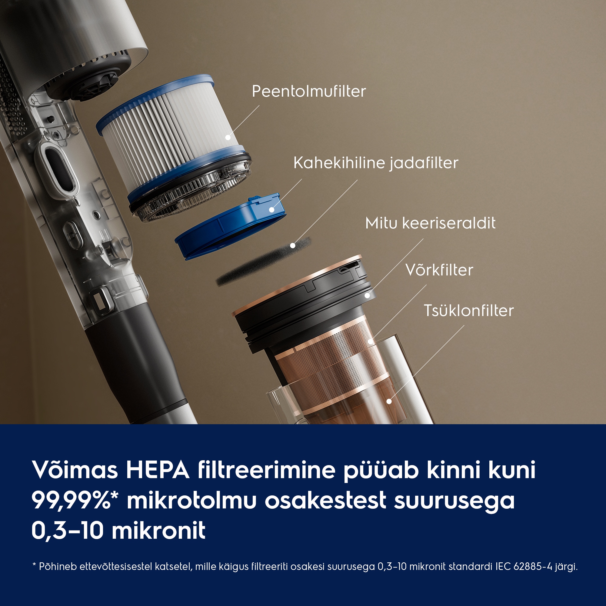Testide alusel vastavalt standardile IEC 62885-2, arvestades keskmist tolmu kogumise tulemust 5,2 ja 5,3 (mõlemas suunas) kõvadel põrandatel. Tulemused põhinevad võrdlusel kuue enimmüüdud käsitolmuimejaga, mille hind ületas 490 eurot neljas Euroopa riigis (okt 2024 – sept 2025).