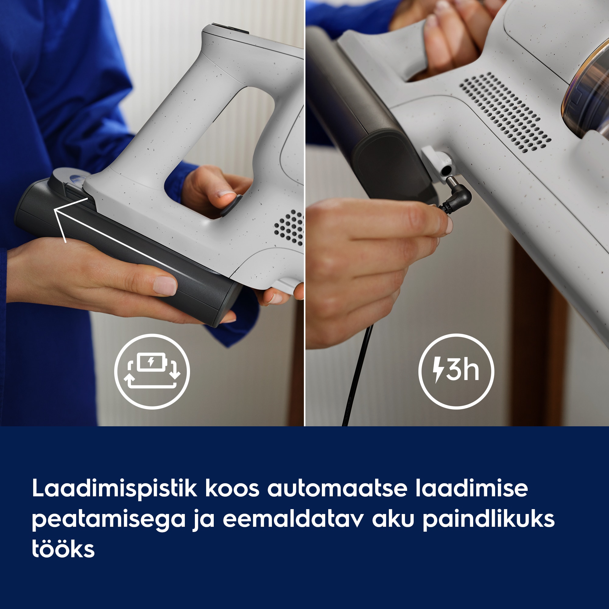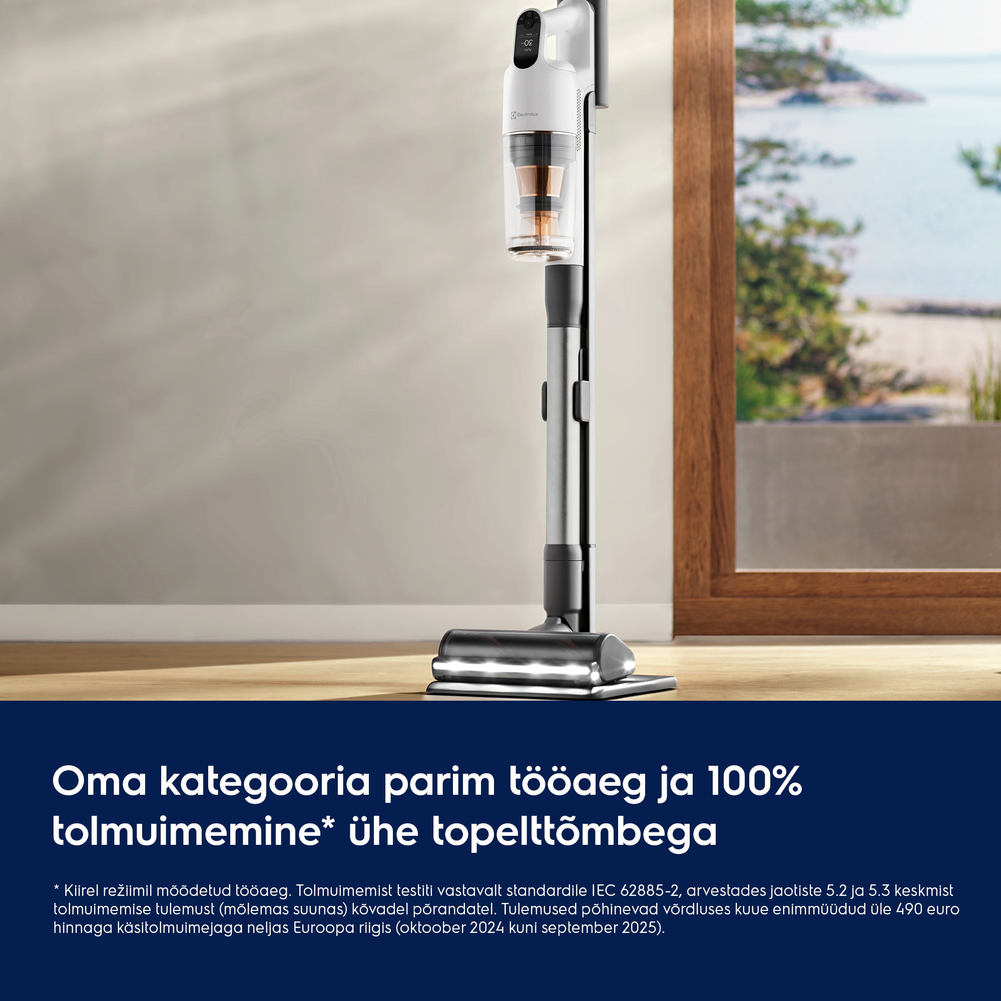* Tööaega on mõõdetud kiirrežiimil. Tolmuimemise tõhusust on testitud standardi IEC 62885-2 järgi, arvestades keskmist tolmuimemise tulemust 5,2, 5,3 (mõlemas suunas) kõvadel põrandatel. Tulemused põhinevad võrdlusel kuue enimmüüdud käsitolmuimejaga, mille hind on neljas Euroopa riigis üle 490 euro (okt 2024 kuni sept 2025).